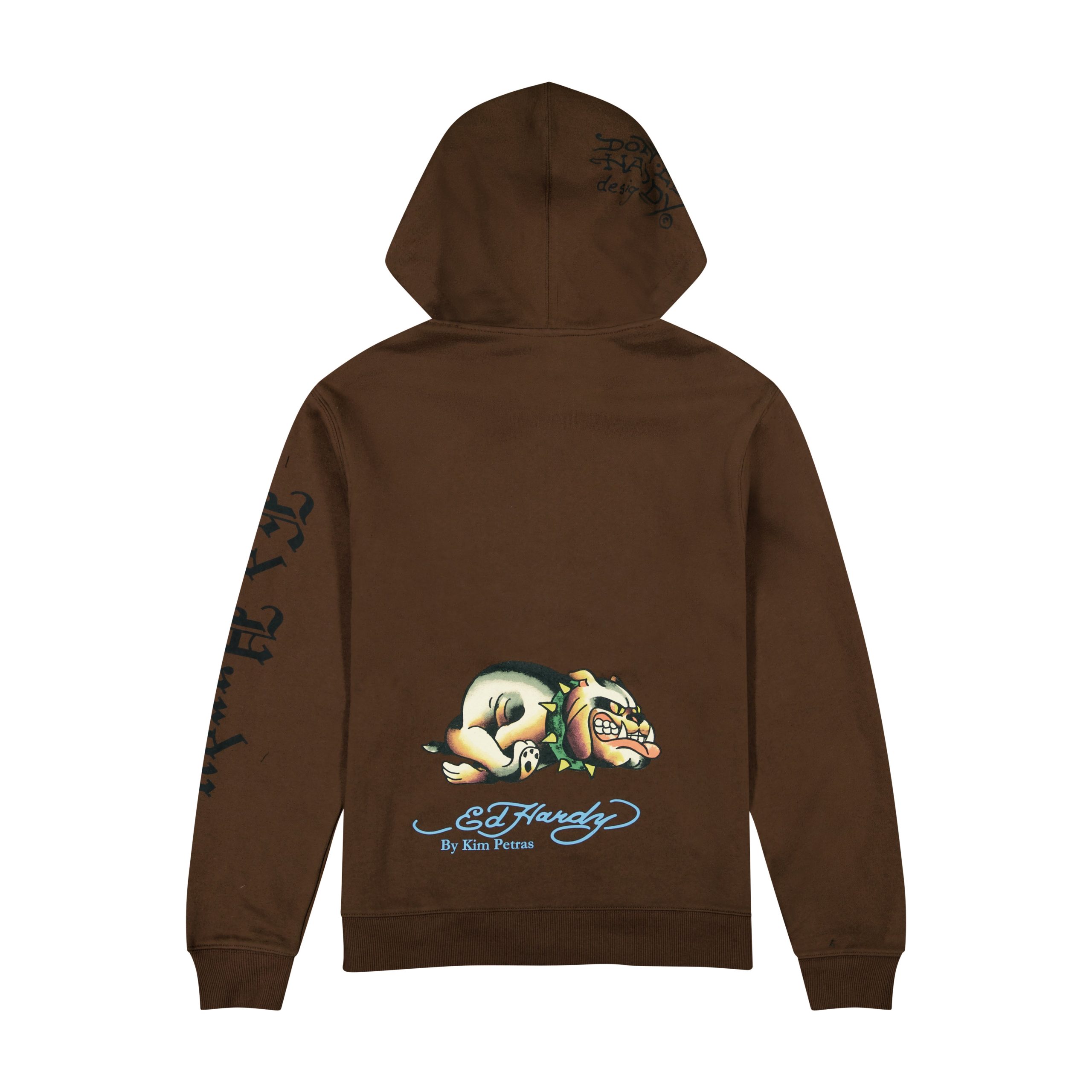 This zip front cocoa hoodie features archival bulldog graphics and two Ed Hardy by Kim Petras logos in blue.