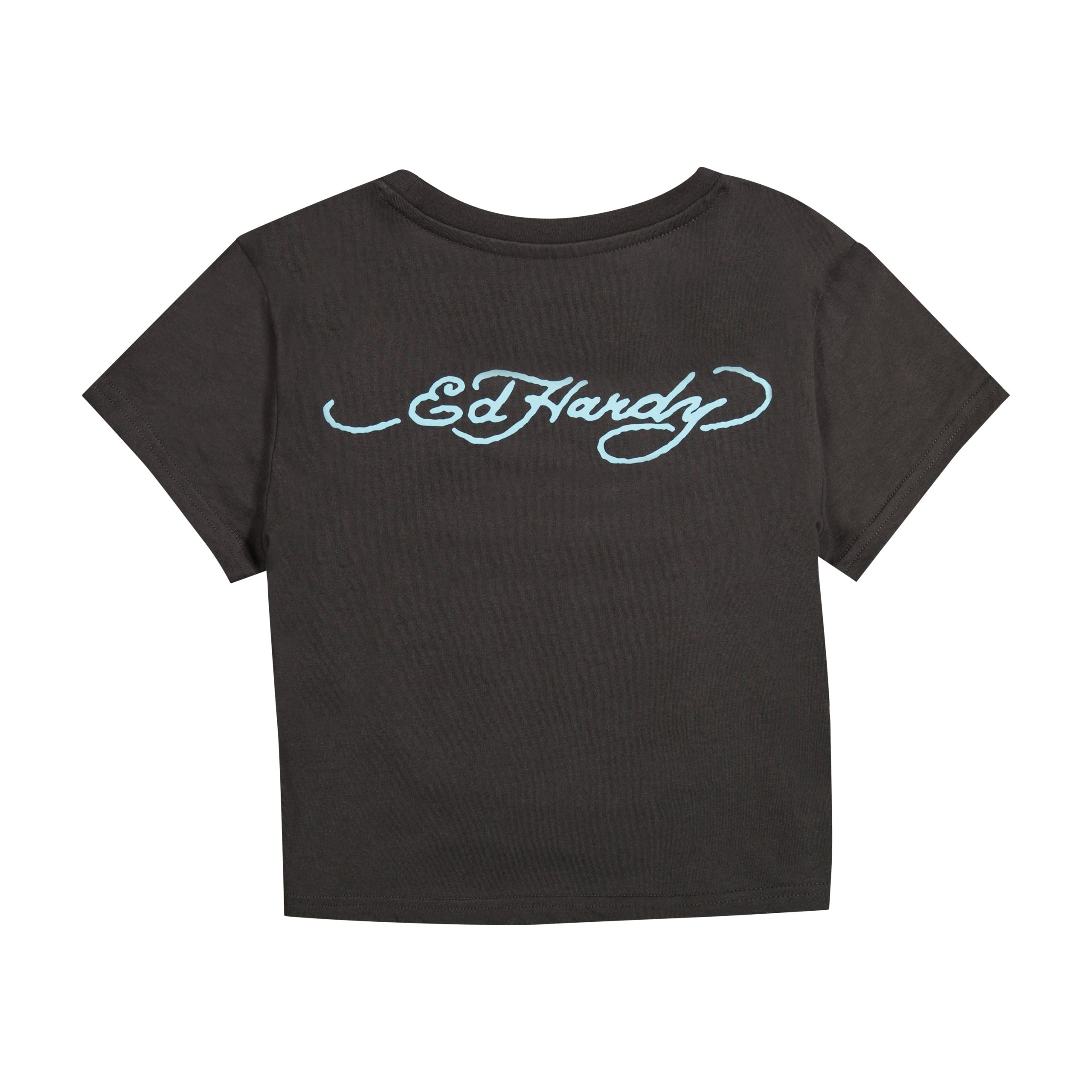 Our classic baby tee silhouette featuring a rhinestone rose cobra graphic and blue Ed Hardy logos. Constructed from a soft cotton blend.?