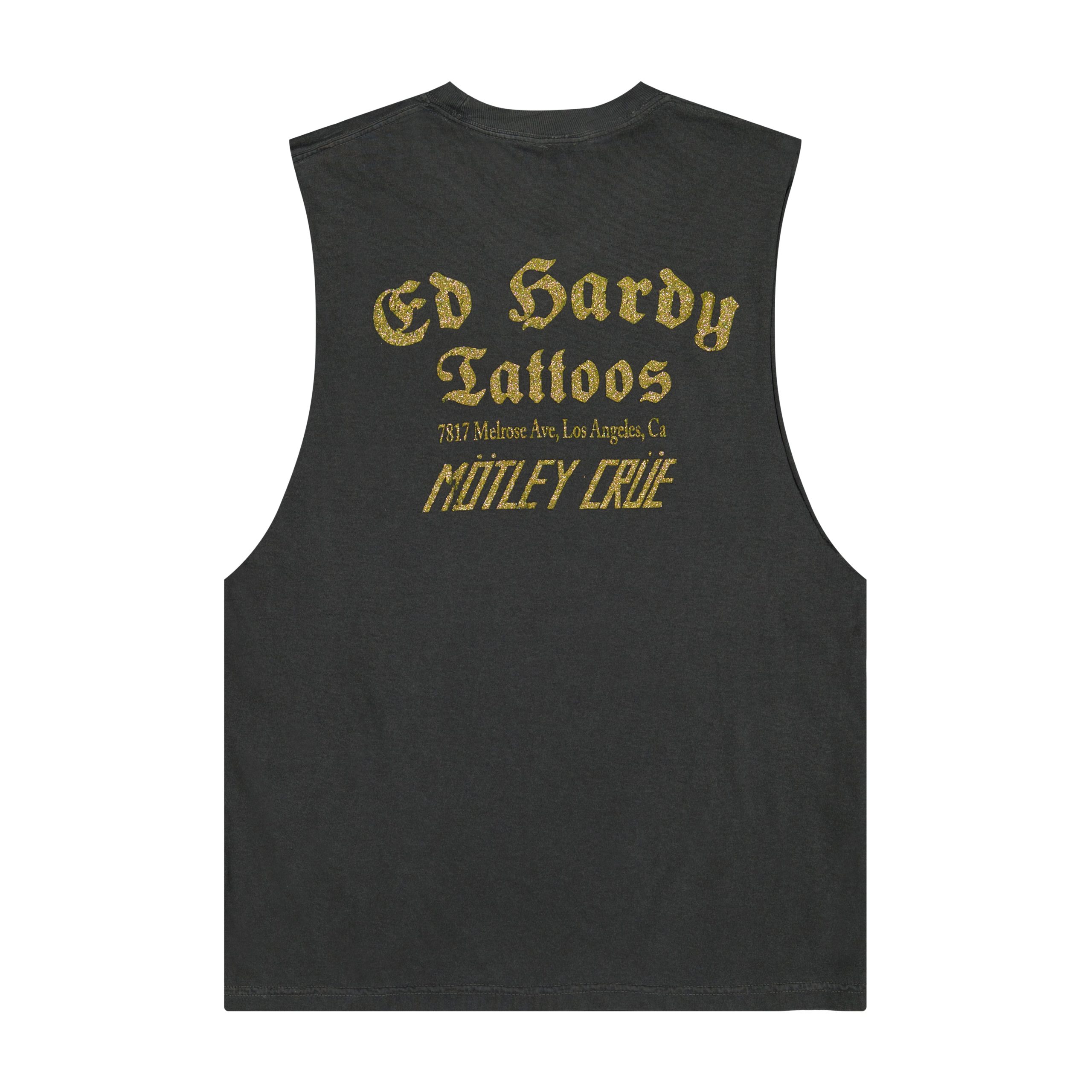 This cutoff tee features a sparkly gold Ed Hardy logo and a Motley Crue Dr. Feel Good graphic
