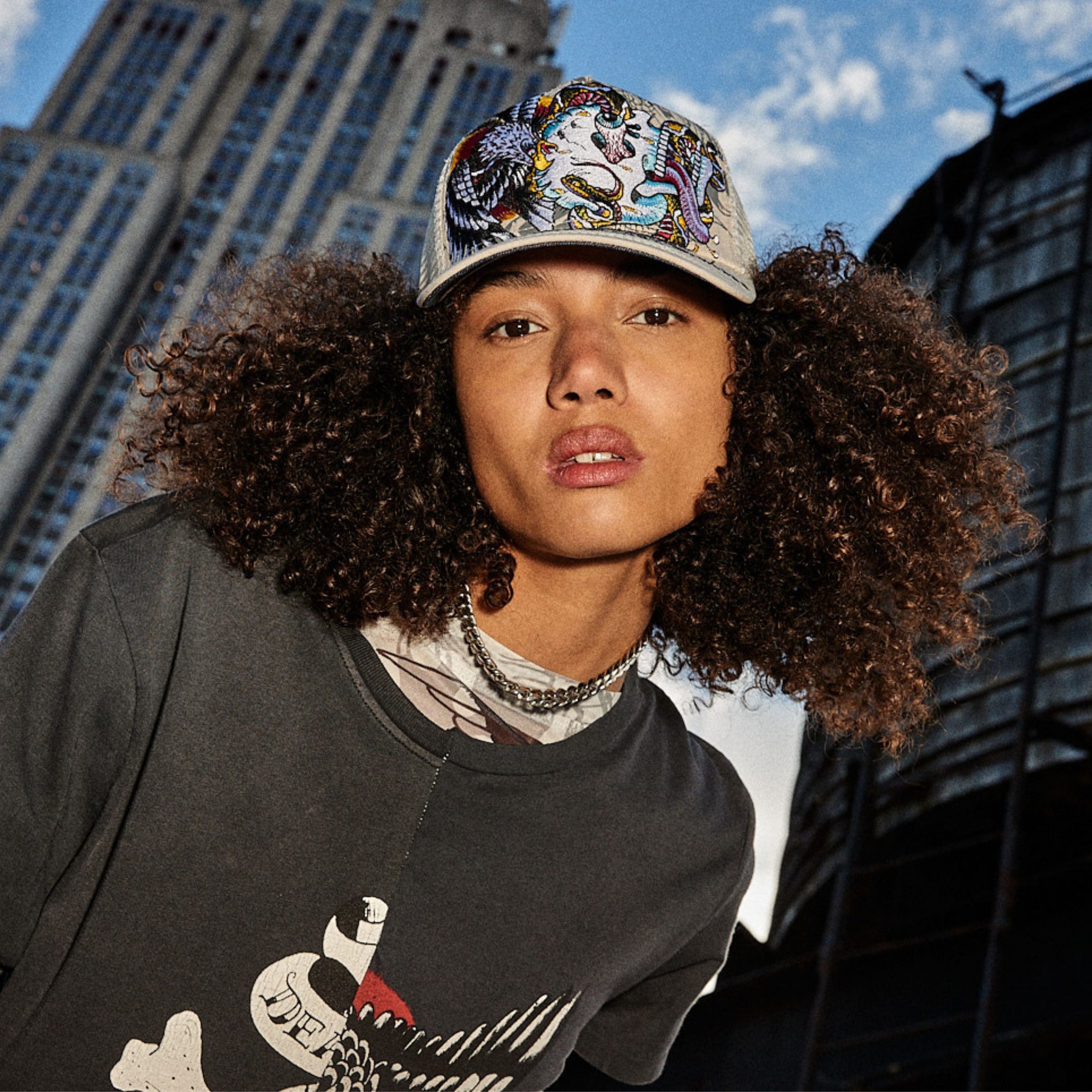 A head-turning hat that effortlessly combines style and attitude. This features a striking Battle Skull design meticulously embroidered. showcasing the iconic Ed Hardy logo. Perfect for those who seek a blend of urban edge and casual cool. this hat adds a bold statement to your look.