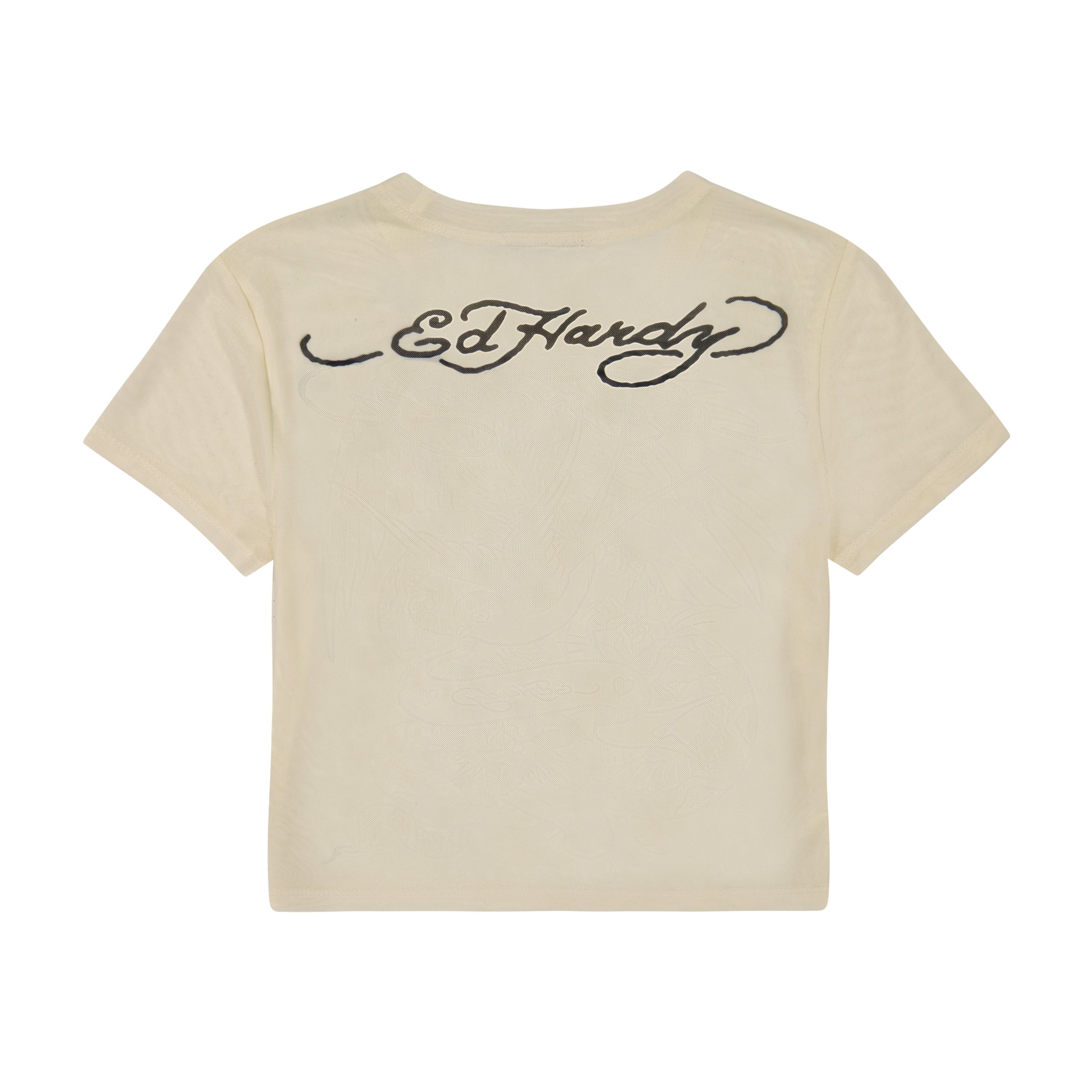 Ivory power mesh in a cropped baby tee silhouette. Complete with Ed Hardy Swallow Bird graphic.