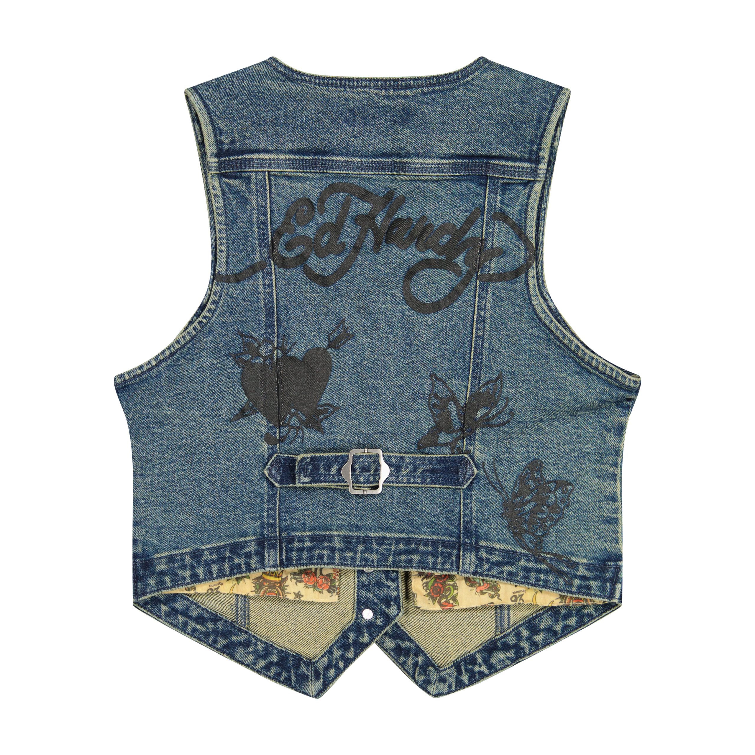 Fitted cropped denim vest cut from a medium tint denim. Features a series of archival graphics and iconic Ed Hardy logos in black.?