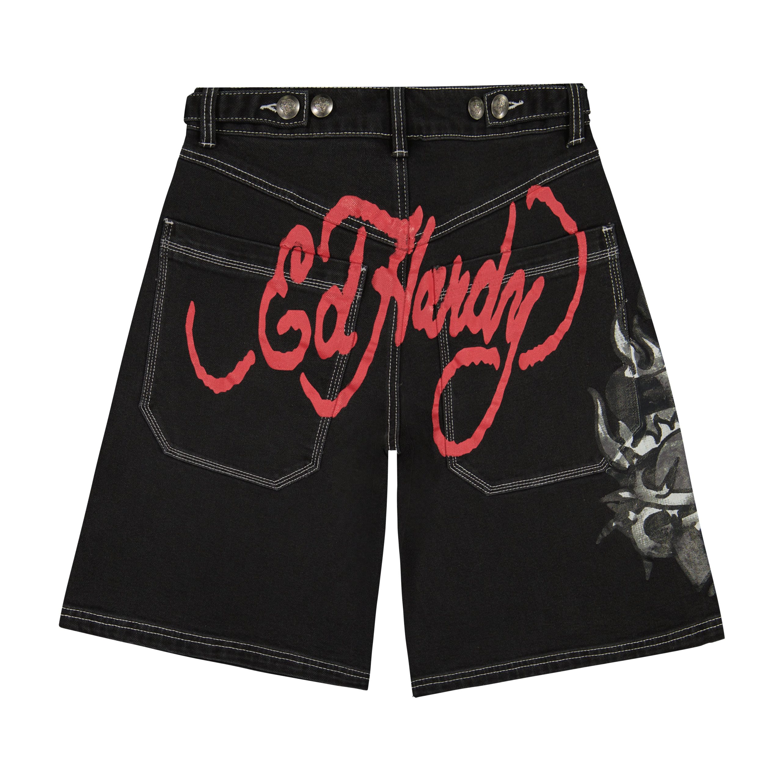 Jorts cut from a black denim in a baggy fit. Features a sacred heart graphic on side and signature logo on back in red.?